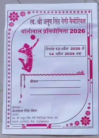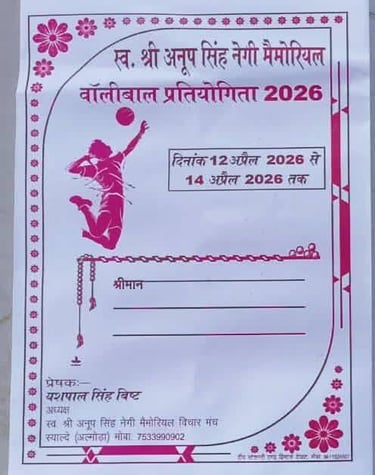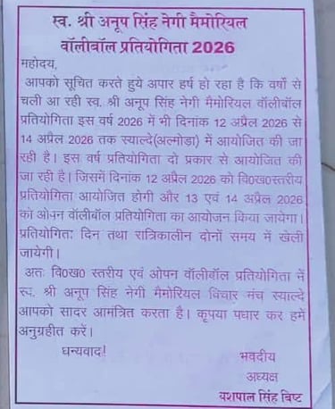स्याल्दे (अल्मोड़ा) में 12 से 14 अप्रैल तक वॉलीबॉल का महासंग्राम - स्व. श्री अनूप सिंह नेगी मैमोरियल वॉलीबॉल प्रतियोगिता 2026 का आयोजन
