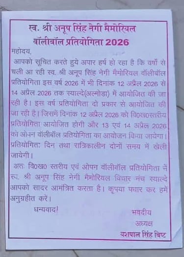 स्याल्दे (अल्मोड़ा): क्षेत्र में खेल प्रतिभाओं को बढ़ावा देने के उद्देश्य से स्व. श्री अनूप सिंह नेगी मैमोरियल वॉलीबॉल प्रतियोगिता 2026 का आयोजन आगामी 12 अप्रैल से 14 अप्रैल 2026 तक स्याल्दे में किया जाएगा। यह प्रतियोगिता पिछले कई वर्षों से आयोजित होती आ रही है और हर वर्ष इसमें युवाओं की उत्साहपूर्ण भागीदारी देखने को मिलती है।